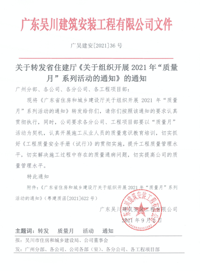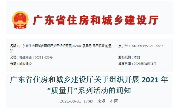 為深入貫徹習近平新時代中國特色社會主義思想,全面落實黨的十九大和十九屆二中、三中、四中、五中全會精神,牢固樹立“質量第一”的意識,不斷提升建筑工程品質,根據《市場監管總局等20個部門關于開展2021年全國“質量月”活動的通知》(國市監質〔2021〕51號),我廳決定于9月組織開展2021年全省住房城鄉建設系統“質量月”活動?,F將有關事項通知如下: