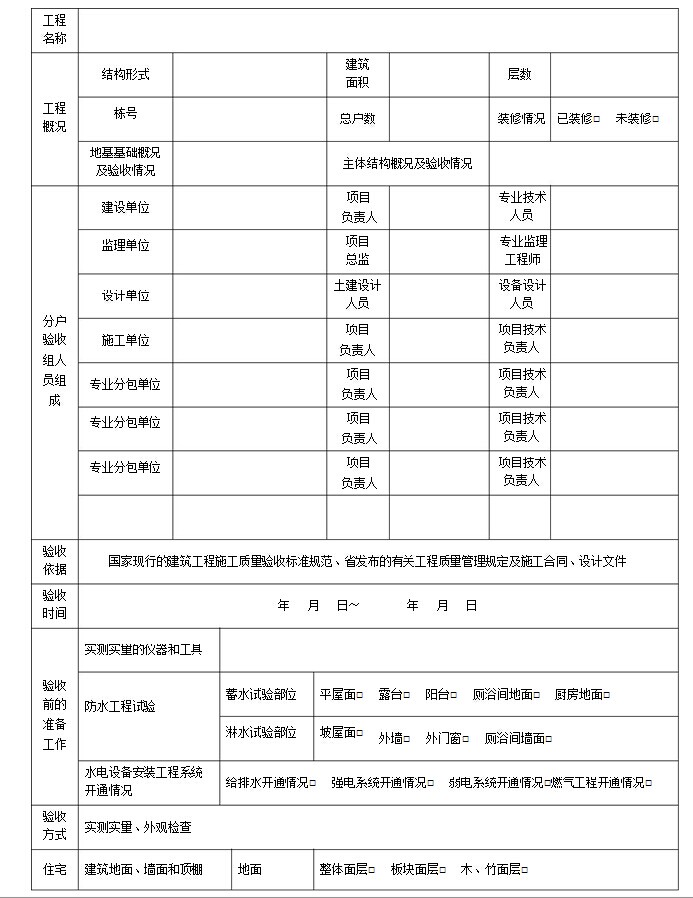 1、建設單位作為住宅工程質量分戶驗收的第一責任人,應根據工程 的實際情況填寫《住宅工程質量分戶驗收方案》; |